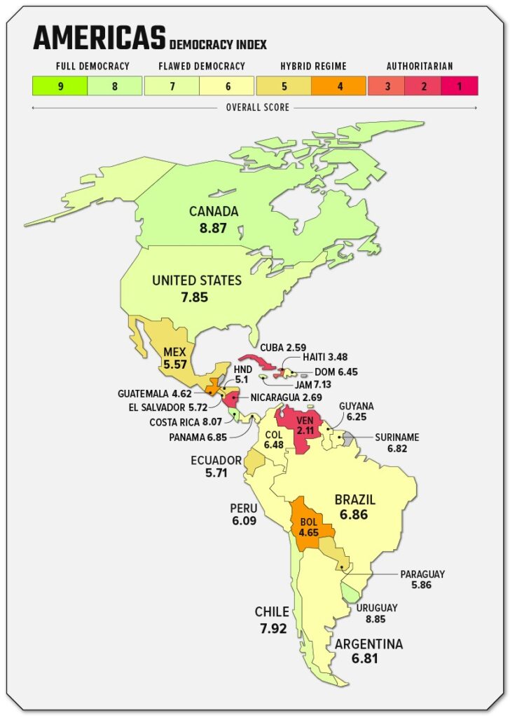 En esta región, los únicos países que entran en la categoría de democracia plena son Costa Rica y Uruguay. En el otro lado del espectro, Venezuela, Nicaragua y Cuba caen bajo la clasificación de régimen autoritario.