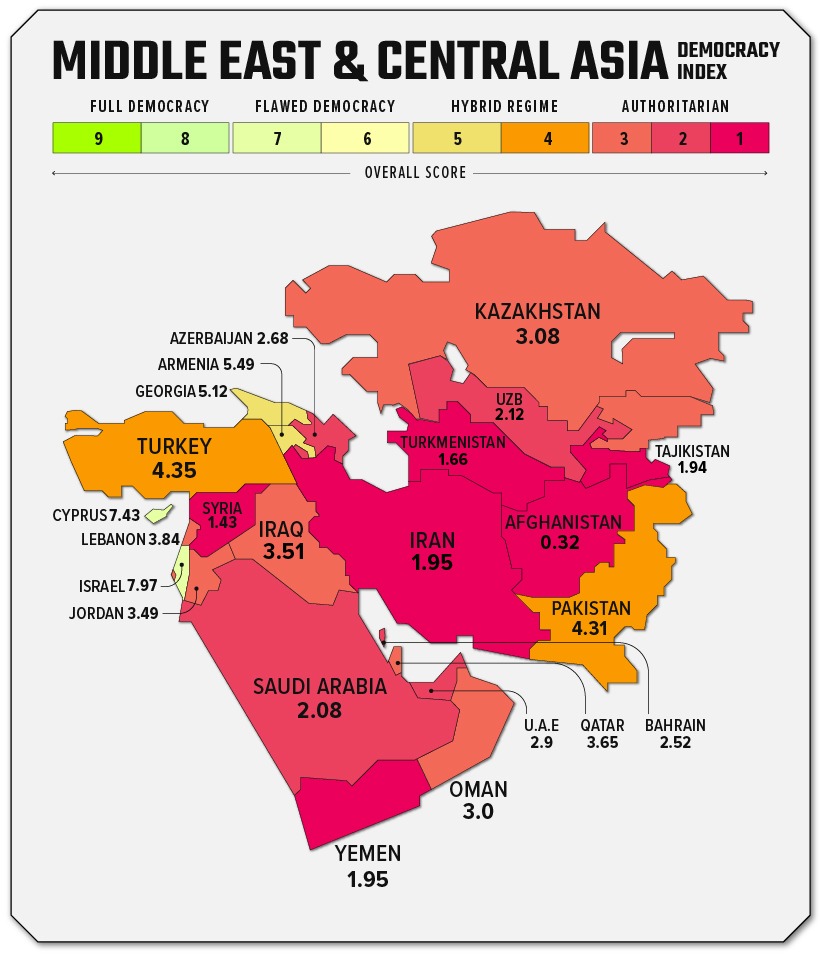 No hay países que entren en la categoría de democracia plena en esta región. Solo Israel (7,97) y Chipre (7,43) se consideran democracias defectuosas. Turquía, Georgia, Armenia y Pakistán entran en la categoría de regímenes híbridos, y el resto de los países de la región se consideran regímenes autoritarios.