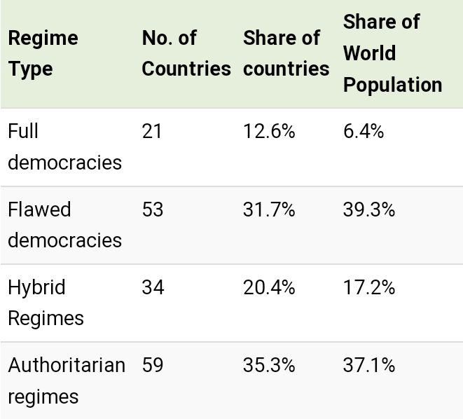 En el informe de este año, la EIU publicó una caída del puntaje global promedio de 5,37 a 5,28, la mayor desde 2010 después de la crisis financiera mundial. Esto se traduce en un hecho seleccionador: solo el 46% de la población vive en una democracia “de algún tipo”.