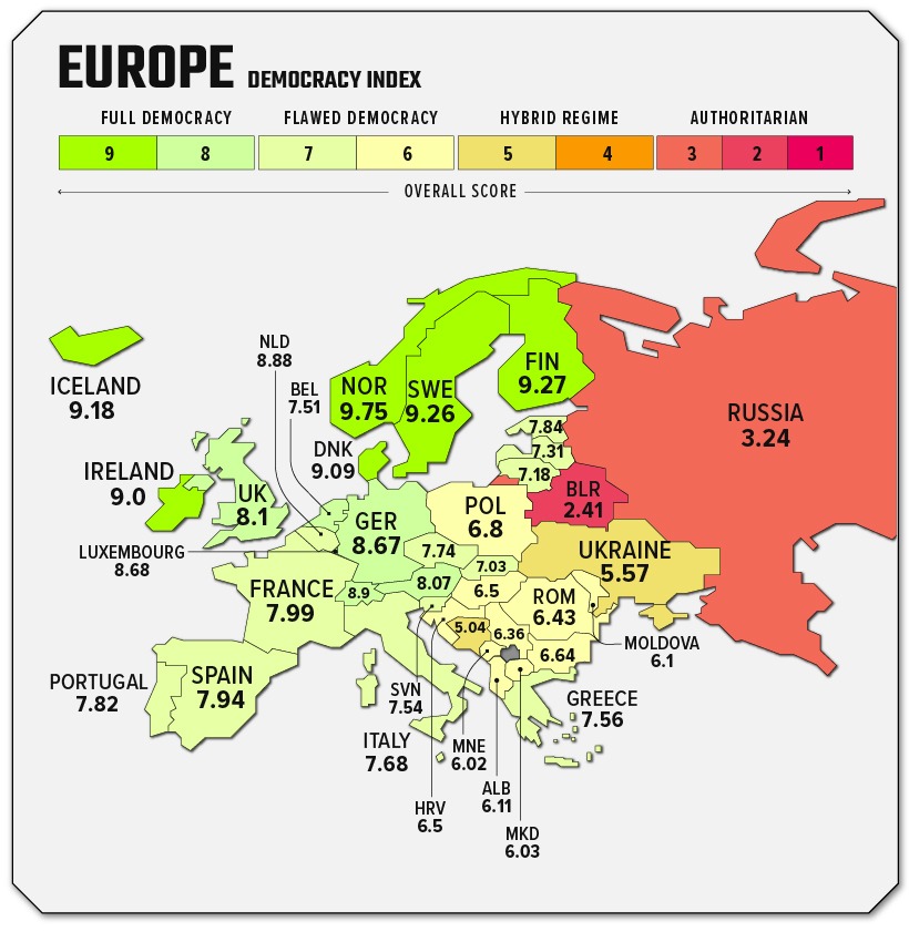 De hecho, cuatro de las cinco principales democracias plenas se encuentran en esta región: Noruega, Finlandia, Suecia e Islandia. Una rebaja notable en esta región ocurrió en España; el país ahora se considera una democracia defectuosa.