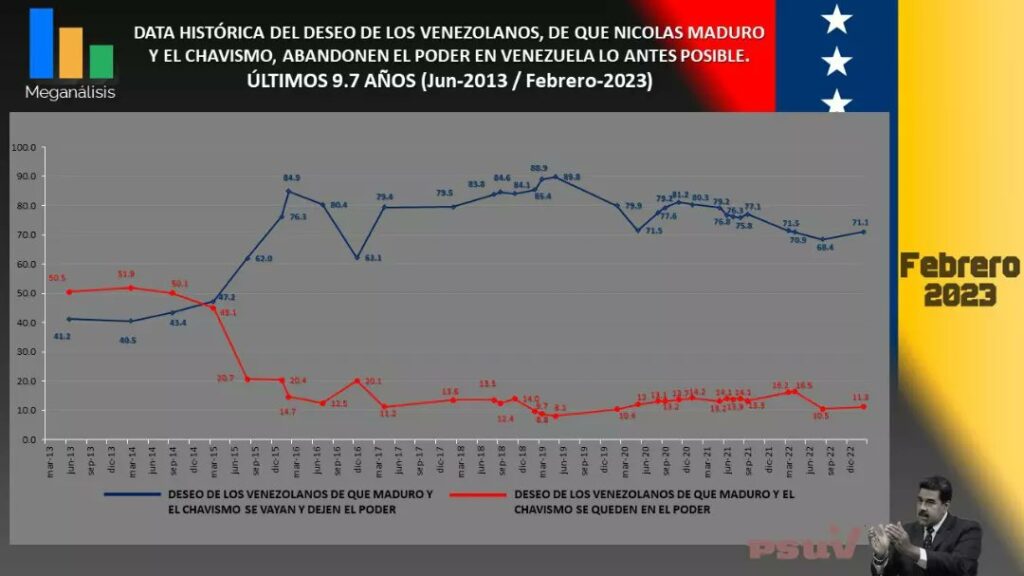 Para el mes de febrero el apoyo y aprobación a Maduro y el chavismo es de solo el 11.3% y el rechazo hacía estos es del 77.1%. Maduro tiene 95 meses consecuivos (casi 8 años) de su ejercicio, siendo abrumadoramente rechazado.