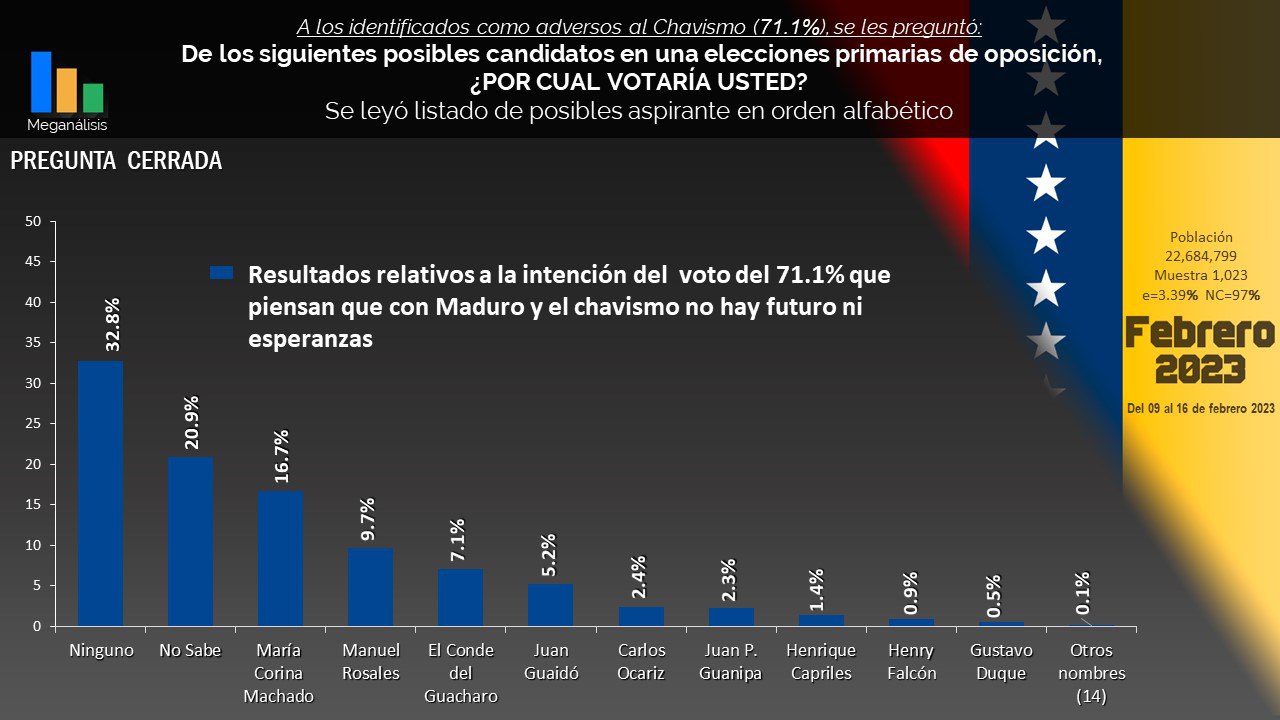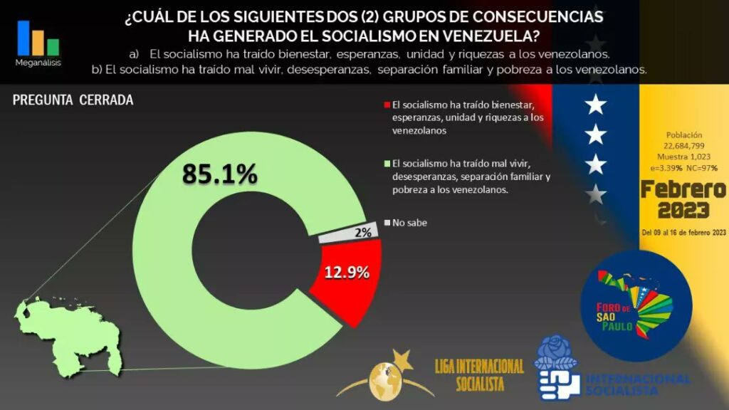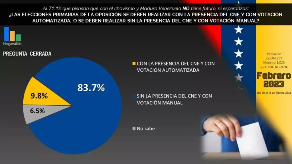 Le empresa de estudios de opinión pública Meganálisis acaba de publicar el resumen de su más reciente estudio en Venezuela, realizado entre el 9 y el 16 de febrero de 2023, bajo la modalidad CATI a 1.023 personas entrevistadas