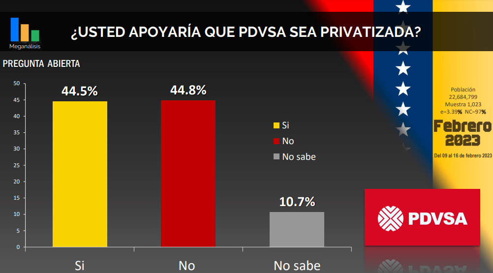 Ante la pregunta abierta, ¿Usted apoyaría que Pdvsa sea privatizada? el 44,5% opinó que Si mientras el 44,8% opinó que No y un 10,7% no sabe.