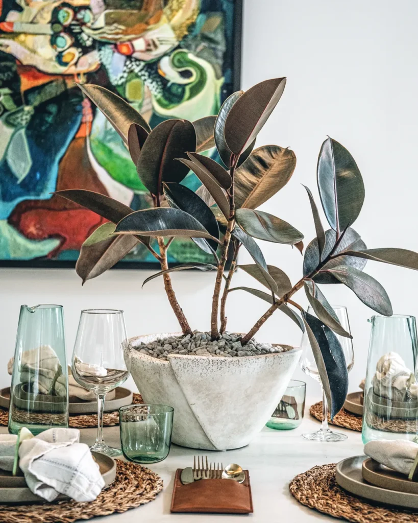 Dado que los restaurantes y las mesas de comedor para fiestas privadas a menudo incorporan macetas de hierbas que los comensales pueden elegir, no sorprende escuchar que los arreglos florales formales en jarrones que sirven como centros de mesa están siendo reemplazados por alternativas más duraderas, como limoneros que crecen en macetas. «Digamos que la ocasión es una fiesta de verano», sugiere Carter en su libro. «Puede colocar un árbol de limón Meyer en el centro de su mesa y recoger limones del árbol para servir en los cócteles que está sirviendo a los invitados. Si tiene una cena íntima con amigos, diseñe las plantas que se sientan bajas en la mesa , como un grupo de suculentas, agregará un toque de vegetación y permitirá que las conversaciones fluyan fácilmente sin bloquear la vista de nadie». Tales ideas concuerdan naturalmente con la actualidad y el creciente compromiso con el diseño biofílico y sostenible; las flores cortadas son un desperdicio en comparación. Otra opción central cada vez más popular son los esquejes tomados de plantas y colocados en agua. Una vez que echan raíces, se pueden sembrar en tierra para crear nuevas plantas. «Estos centros de mesa mantienen el aspecto que buscas durante mucho más tiempo que los que tienen flores cortadas», señala Carter.