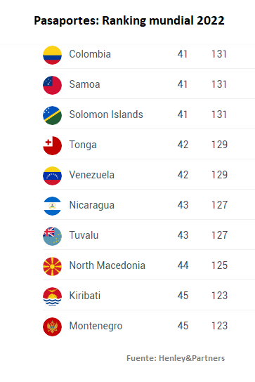 En el ranking 2022, el pasaporte venezolano ocupa el puesto 42, compartido con Tonga, ambos con 129 países de libre acceso.