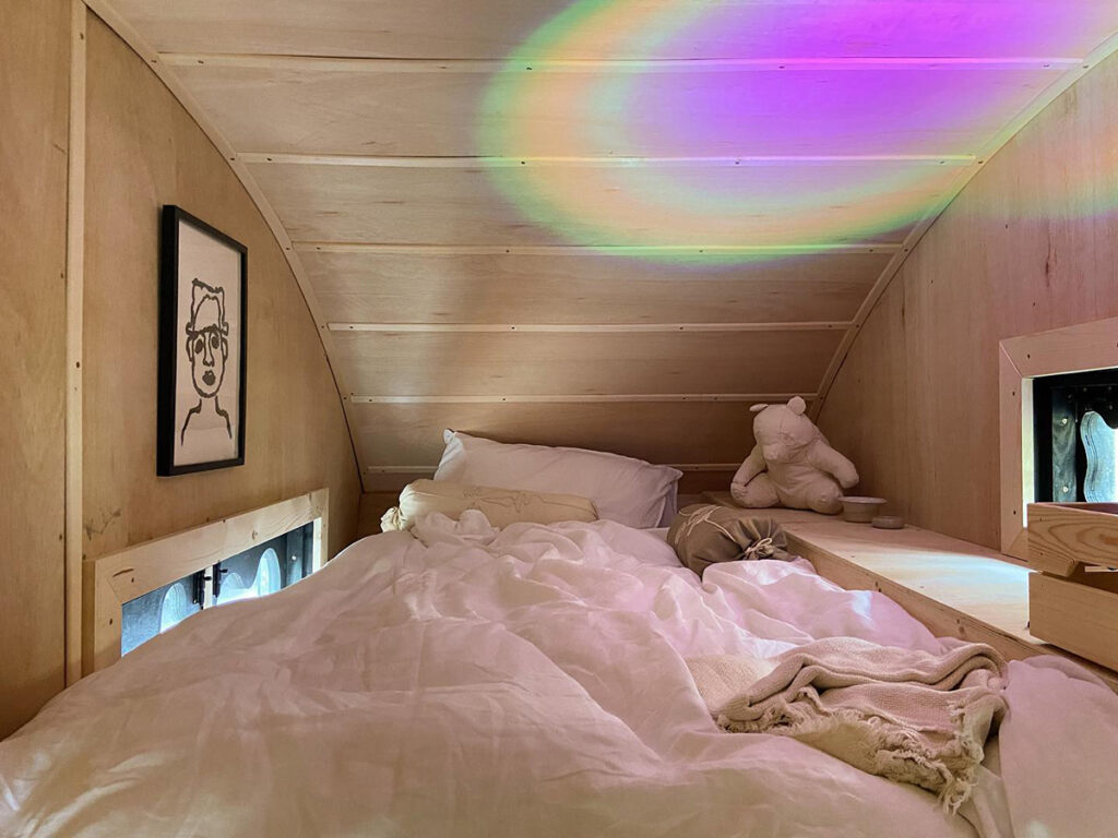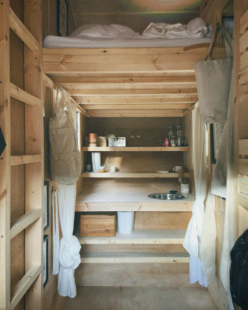 En el interior hay una litera, una cocina e incluso un pequeño baño, todo construido en madera, dando al lugar una sensación acogedora y cálida. Le llevó poco más de un mes construir el soporte de madera que cuelga sobre el contenedor de basura y arreglar el lugar.