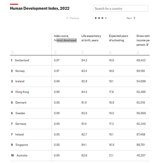 Suiza encabezó las listas por segundo año consecutivo. Su puntuación general se ve impulsada por los altos ingresos y la larga esperanza de vida. Otros países de Europa occidental tienen algunas de las puntuaciones más altas. Algunas partes de Asia también obtienen buenos resultados, con Hong Kong y Singapur entre los diez primeros. En otros lugares es más sombrío: países como Perú, Colombia, Libia y Líbano han logrado pocos avances desde 2019. Los niveles de vida en Ucrania y Rusia también han caído: los países cayeron 23 y cuatro lugares respectivamente entre 2021 y 2022. Yemen, devastado por la guerra , el pobre y endeudado Belice y Micronesia, un país insular en riesgo de ser tragado por el aumento del nivel del mar, alcanzaron su punto máximo en 2010 y han disminuido cada año desde entonces.