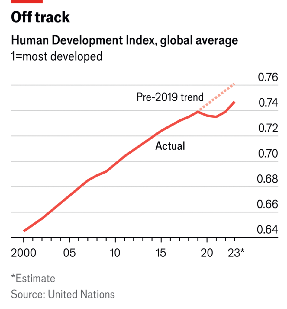 Pero sí proporciona una medida consistente para los formuladores de políticas y las ong . Sus proyecciones regionales para 2023 muestran que los niveles de vida aumentarán aún más; Sólo el mundo árabe no habrá recuperado completamente su puntaje en 2019. Sin embargo, la tendencia a largo plazo parece haber sufrido un retroceso permanente desde la pandemia (ver gráfico). El valor para 2022 y la proyección para 2023 sugieren que el desarrollo puede estar estancado en una trayectoria inferior a la tendencia anterior a 2019, que se había mantenido firme desde 1999.