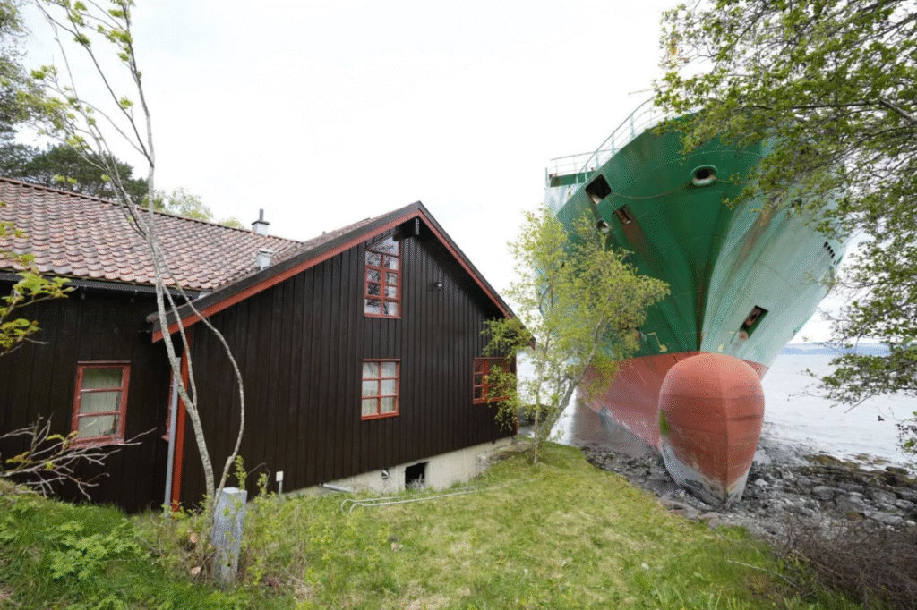 Las imágenes muestran la proa roja y verde del barco a pocos metros de la casa de Helberg. Helberg declaró a NRK que el único daño fue el cable de una bomba de calefacción.
