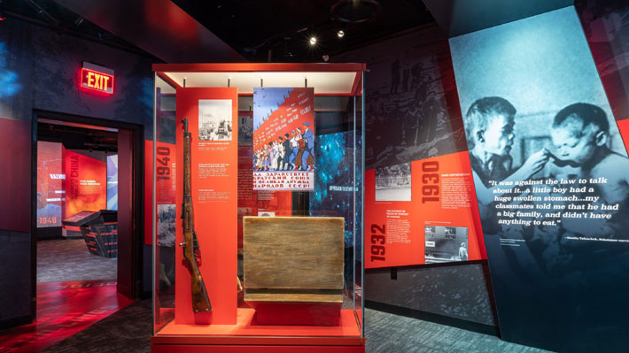 Los visitantes también pueden ver documentales y participar en exhibiciones interactivas de las historias de víctimas y sobrevivientes. En las exposiciones se ven imágenes de hechos históricos, como las deportaciones masivas y limpiezas étnico-religiosas tras la revolución bolchevique, las víctimas de la Revolución Cultural de Mao Zedong, y la matanza en la plaza de Tiananmen, entre otras; así como de otros sucesos más recientes, como los trabajos forzados en Corea del Norte y el genocidio de los uigures en China.