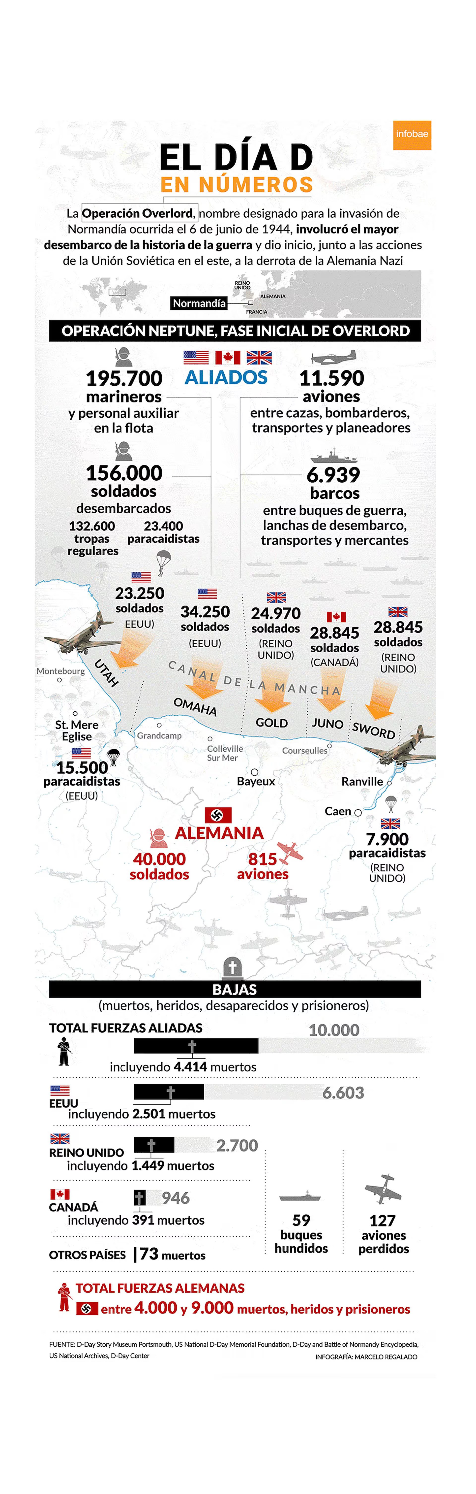 Era una operación militar de por sí arriesgada. Suponía una organización densa, con silencios y espionaje, una planificación extensa que ameritaba un despliegue de tropas estadounidenses para entrenarse junto a sus pares británicos y ensayar acciones navales. La avanzada exigía, a su vez, la intervención de una flota naval y aérea nunca antes registrada, más cientos de miles de soldados que debían trasladarse desde el sur de Inglaterra hasta el noroeste francés por un canal hostil, repleto de minas. El Día D desembarcaron 156.115 soldados en las costas de Normandía: 23.400 tropas aerotransportadas (paracaidistas y en planeadores) y 132.600 regulares, según precisiones del Museo de la Historia del Día D en Portsmouth, Inglaterra, y del US National Archive (Archivo Nacional de Estados Unidos). De este total, 73.000 soldados eran estadounidenses (15.500 aerotransportados y 57.500 regulares), 61.715 británicos (7.900 aerotransportados y 53.815 regulares) y 21.400 canadienses.