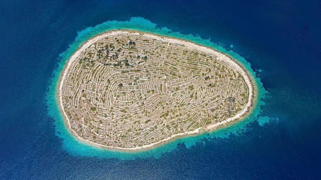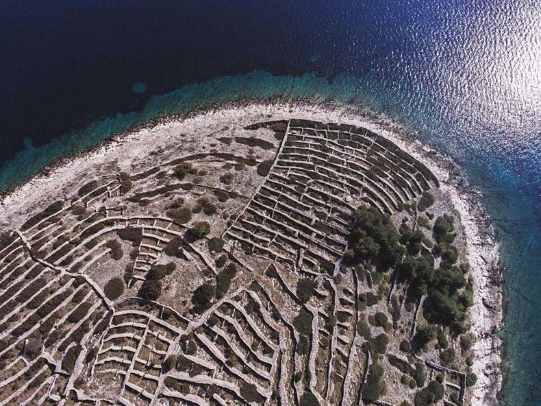 Los agricultores de la isla cercana de Kaprije terminaron de levantar estos muros, sin ningún tipo de conglomerante, para proteger los cultivos del viento y separar los terrenos de viñas y olivares.