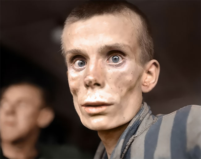 Un prisionero ruso de 18 años traumatizado mira fijamente a la lente de la cámara en medio de la liberación del campo de concentración de Dachau, Alemania, en 1945.