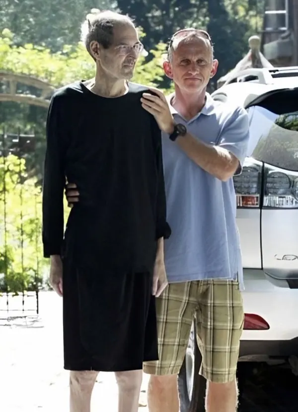 En una de sus últimas fotografías, se ve a Steve Jobs caminando lentamente afuera de su casa en Palo Alto, vistiendo un suéter negro y jeans, con el rostro delgado y el cuerpo frágil.