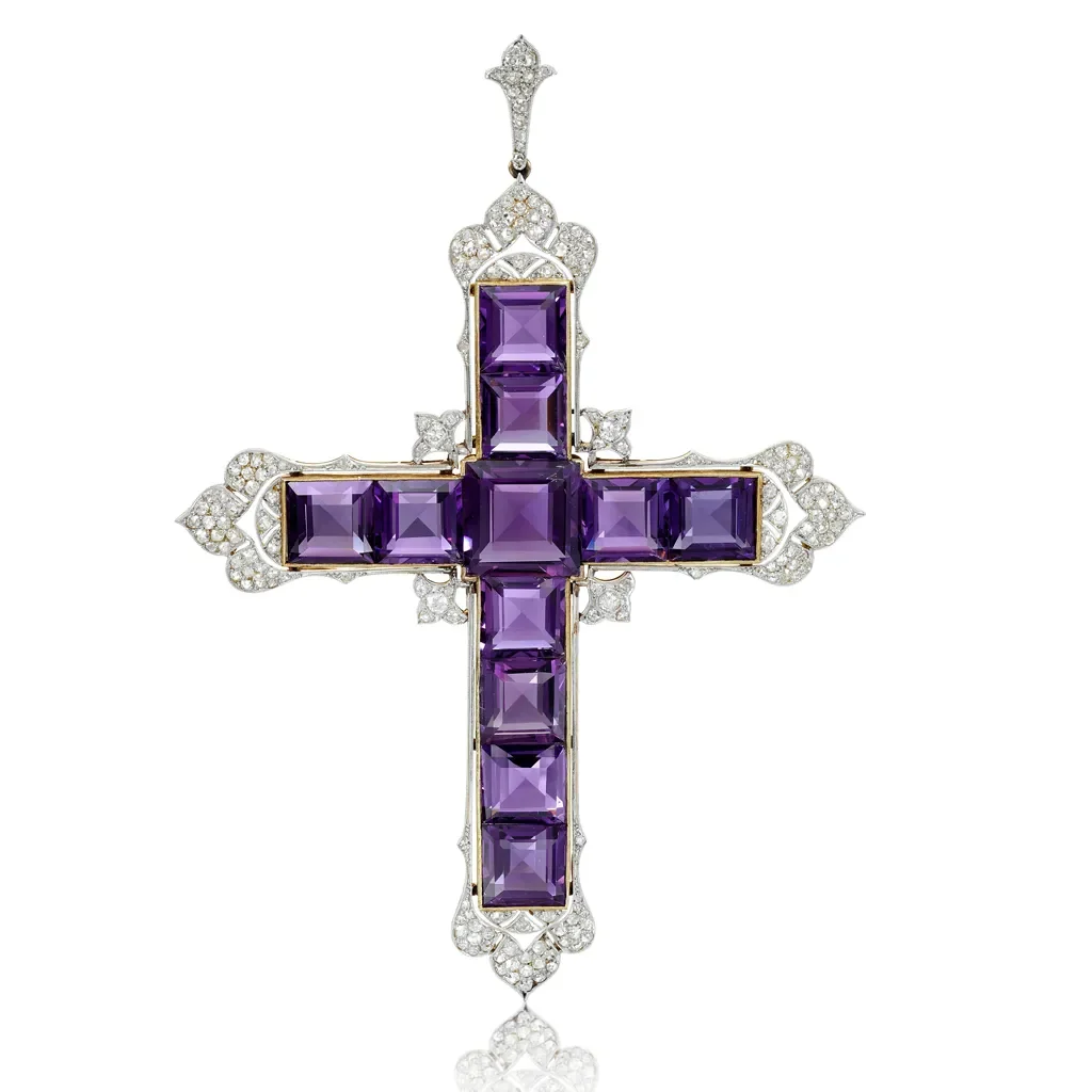 La llamativa cruz de Kardashian, con sus amatistas de corte cuadrado compensadas por diamantes de 5,2 quilates, fue creada en la década de 1920 por el joyero londinense Garrard. La empresa era una de las favoritas de la fallecida Diana, princesa de Gales, y la empresa diseñó sobre todo su anillo de compromiso. Sin embargo, el colgante enjoyado nunca perteneció a Diana: se lo prestó en varias ocasiones su tocayo Naim Attallah, amigo cercano de Diana y director general adjunto de Asprey & Garrard en ese momento, quien, según su hijo, solo permitió que el princesa para usarlo. En opinión de Molesworth, Kardashian es una propietaria apropiada para la pieza: «Ella es una mujer que se hizo a sí misma, comprando para sí misma: una gran señal para la igualdad de clase y género en el mundo del coleccionismo comercial».